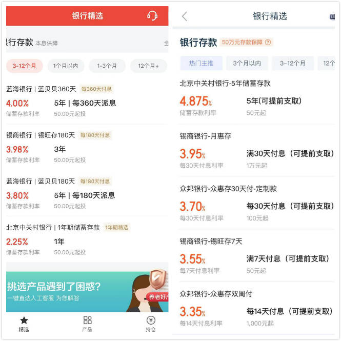據(jù)了解,通過(guò)平臺(tái)銷售的存款產(chǎn)品,全部為個(gè)人定期存款,以3年、5年期為主,3年期利率最高為4.125%、5年期4.875%,均已接近或達(dá)到全國(guó)自律定價(jià)機(jī)制上限。近半數(shù)產(chǎn)品的起存金額僅50元,且均可提前隨時(shí)支取。